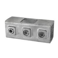 Buiskoppeling Kruisstuk in 1 vlak - vierkant - 25 mm, type 22 is een vierkante verbindingsklem voor een 90° verbinding tussen één ononderbroken steigerbuis (middelreling) en 2 haaks geplaatste buizen (relingstijlen), in één plat vlak. De haaks geplaatste buizen lopen in de buiskoppeling tegen de doorlopende buis aan. Deze vierkante buiskoppeling is zeer geschikt voor het bouwen van solide, vlakke constructies.